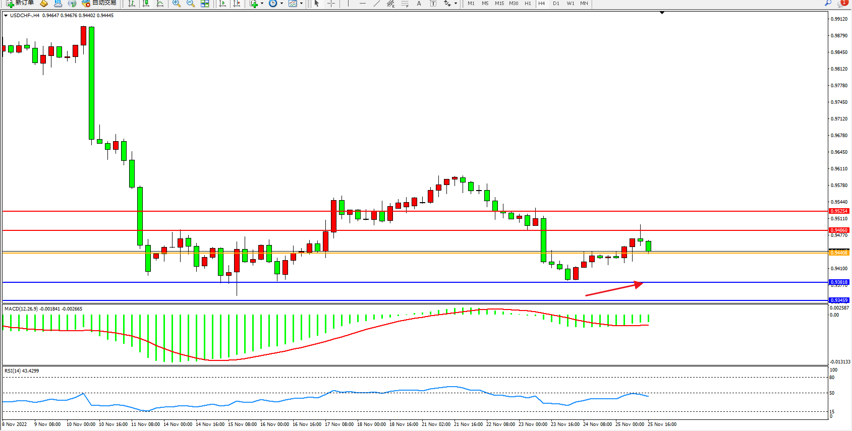 支撑:0.93818、0.93459