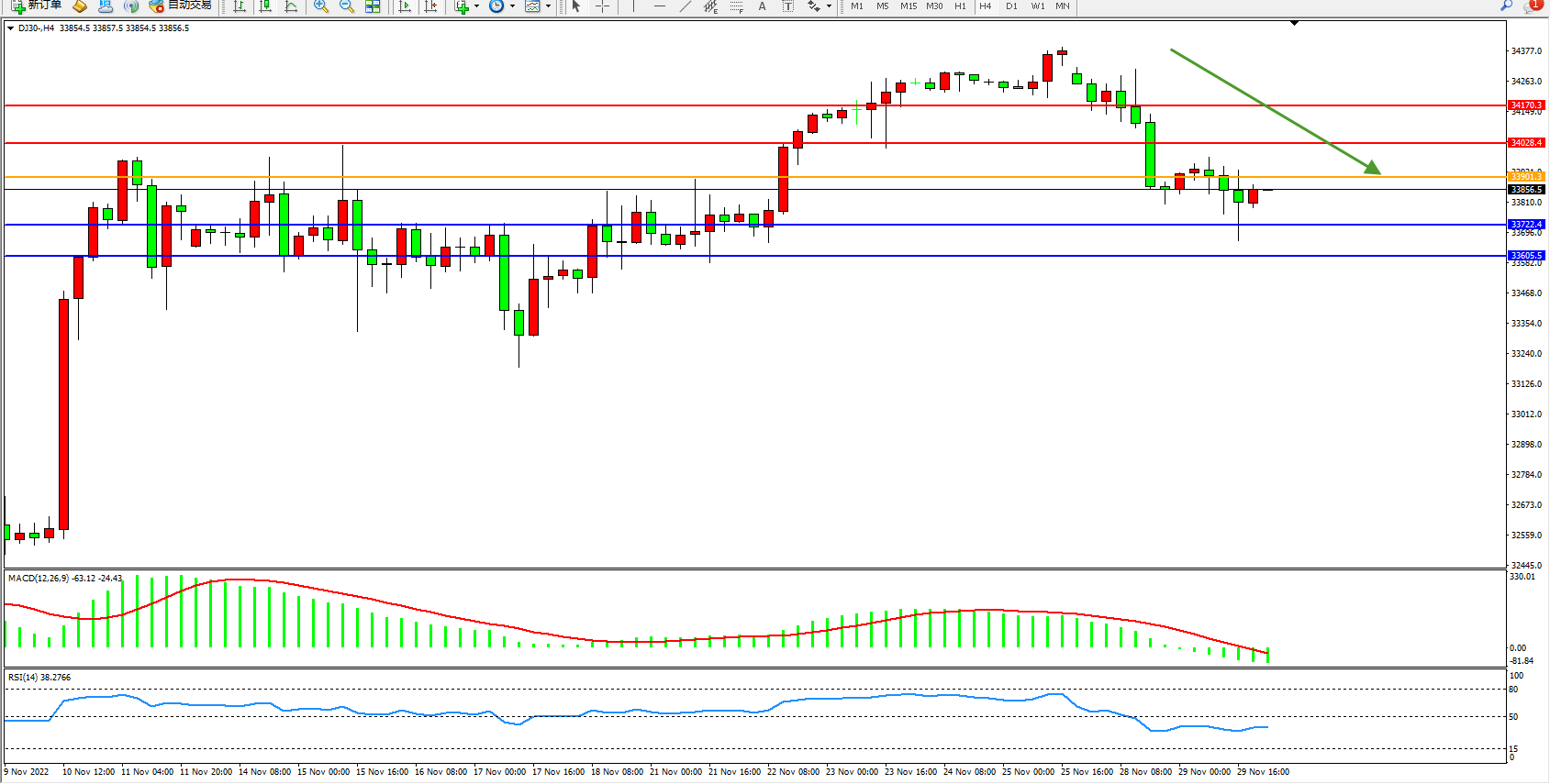 道琼斯指数DJ30——4小时K线图显示: