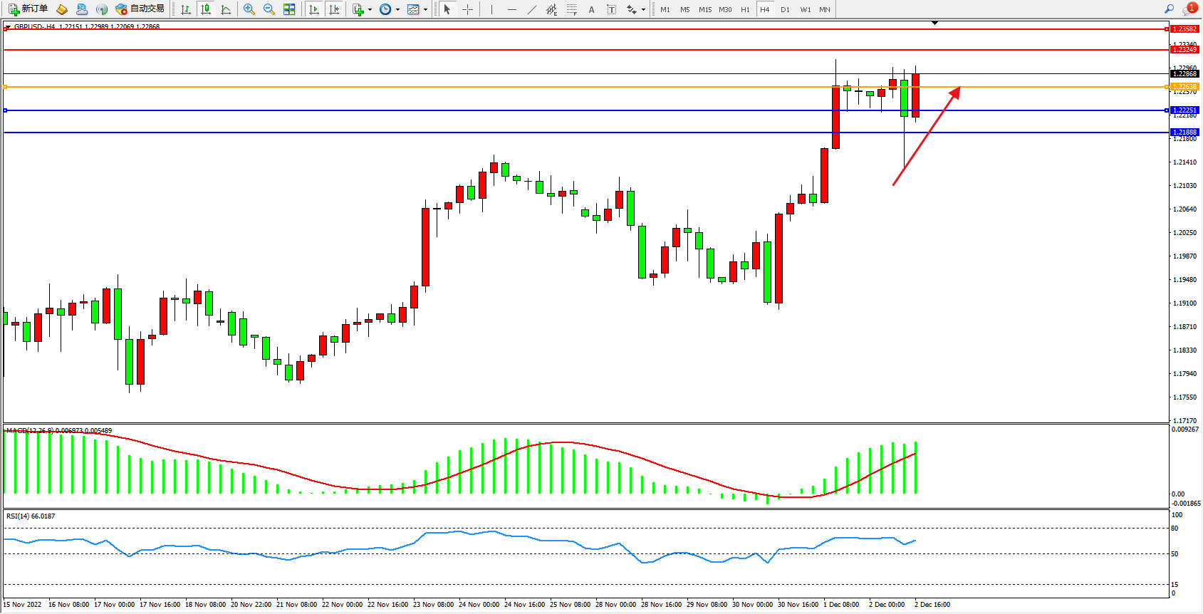 交易策略:1.22638上方看涨,目标1.23249、1.23582