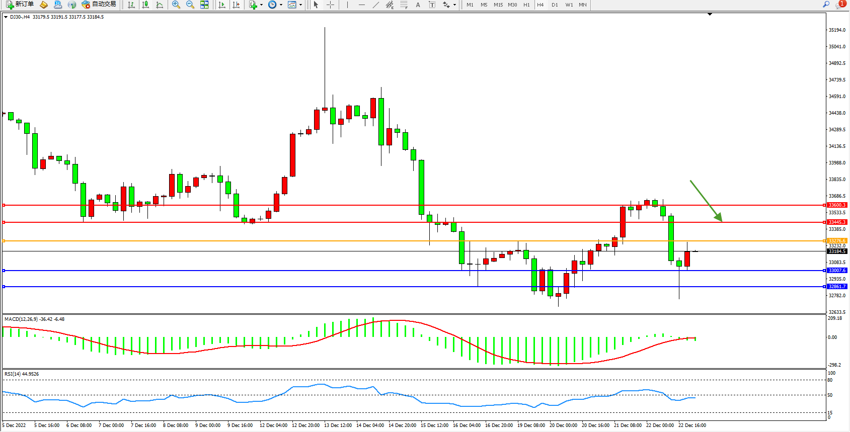 道琼斯指数DJ30——4小时K线图显示: