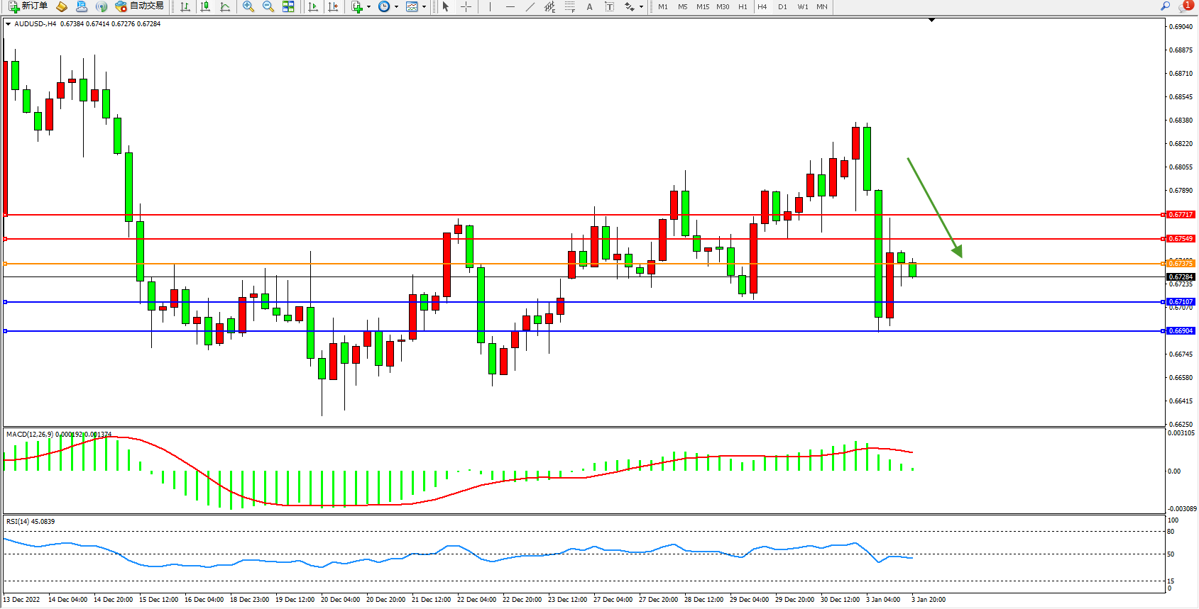 澳元美元AUDUSD——4小时K线图显示: