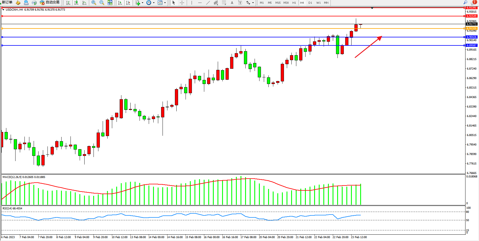 美元人民币USDCNH——4小时K线图显示: