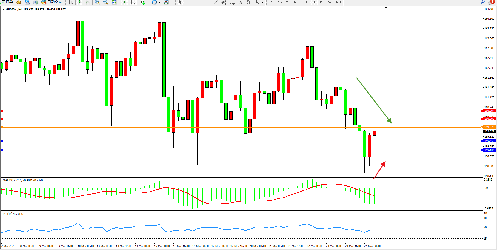 交易策略:159.976下方看跌,目标159.456  159.106