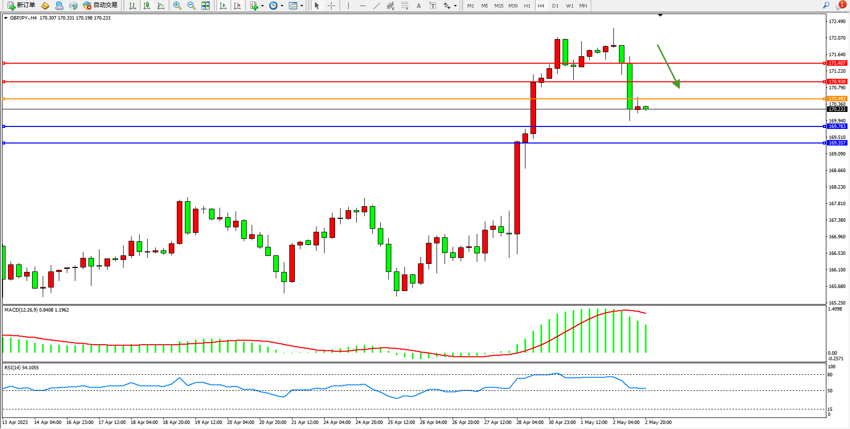 交易策略:170.492下方看跌,目标169.783 169.357