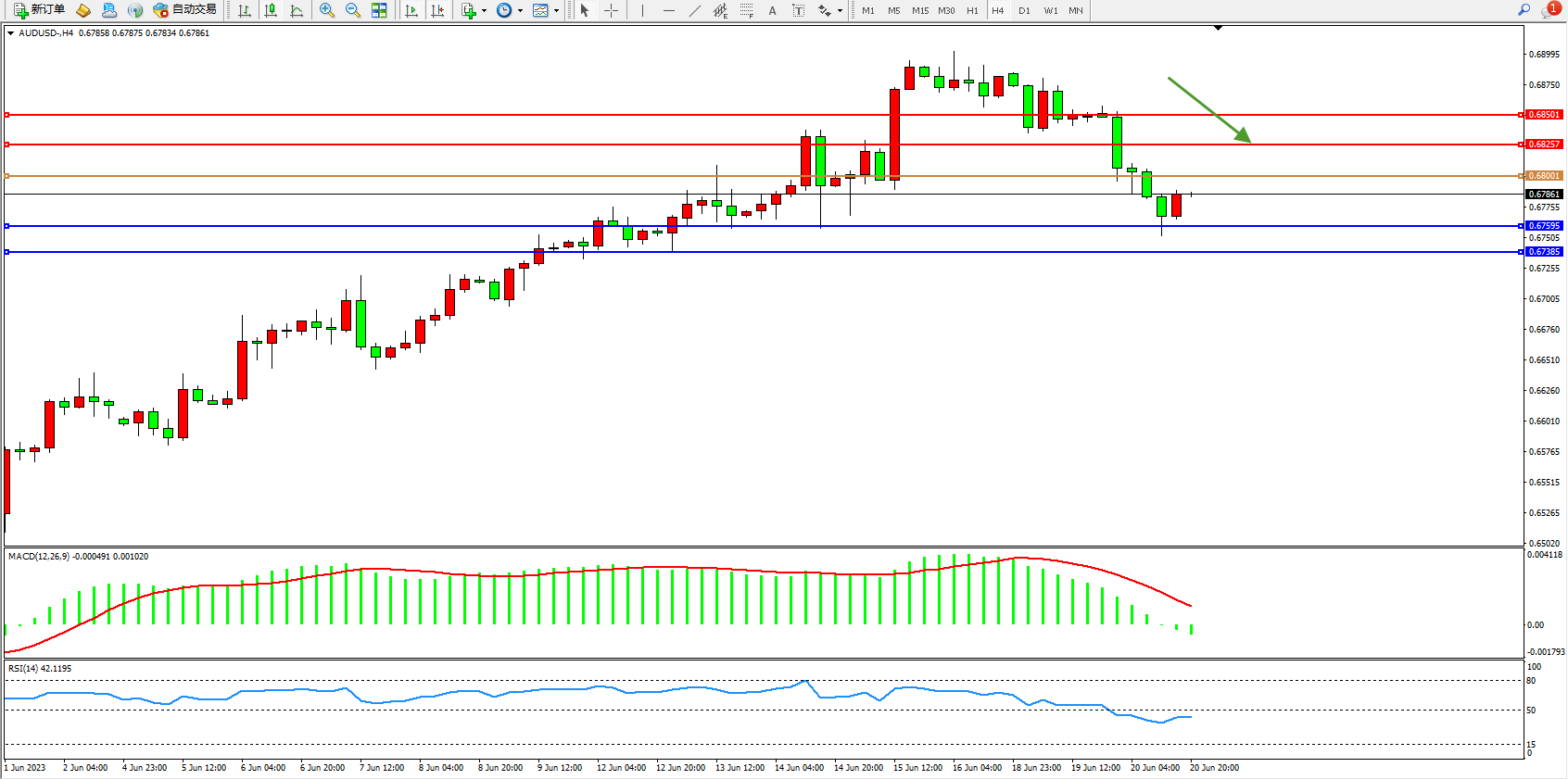 澳元美元AUDUSD——4小时K线图显示: