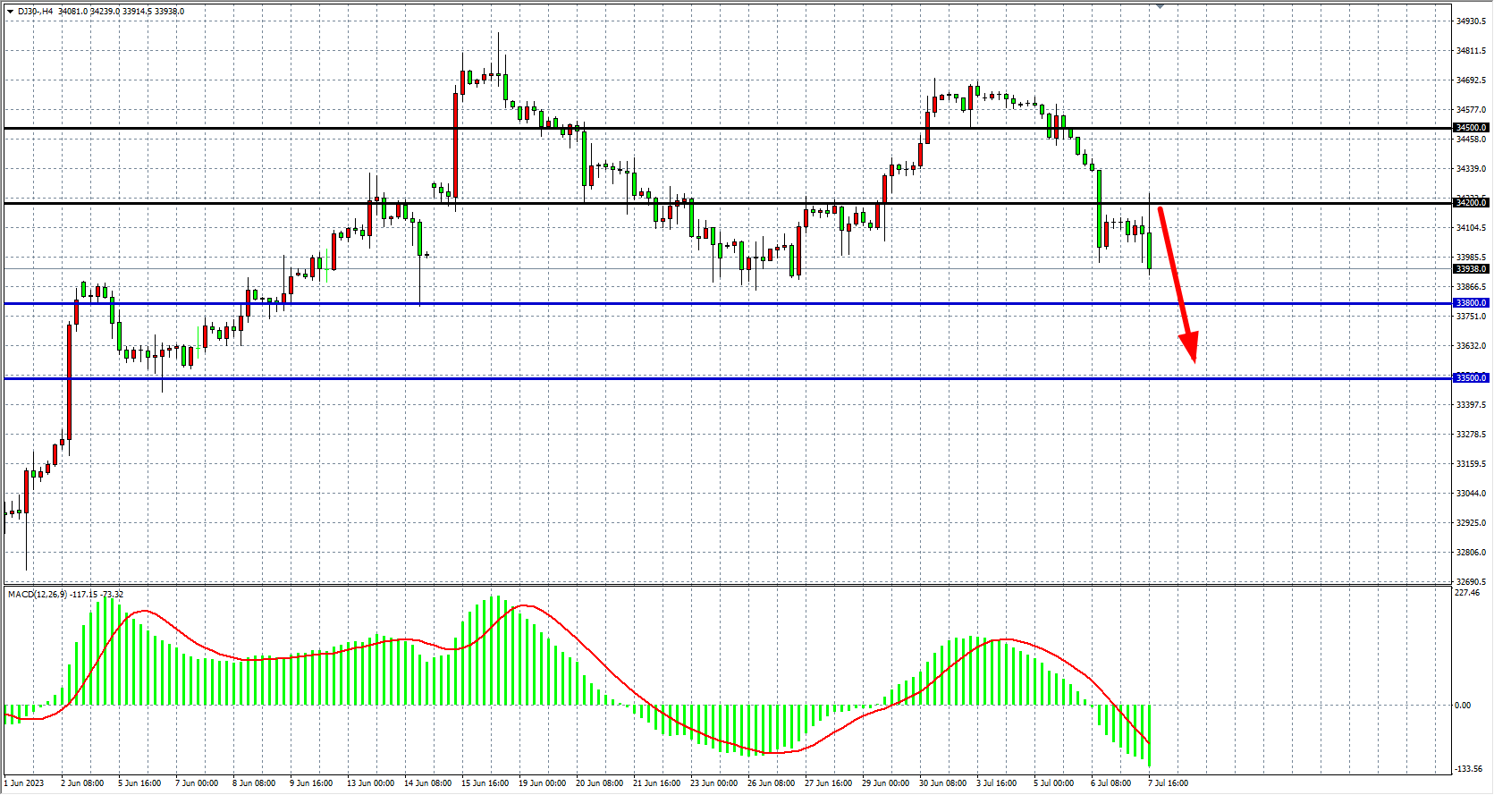 交易策略:34200 下方看跌,目标 33800 33500