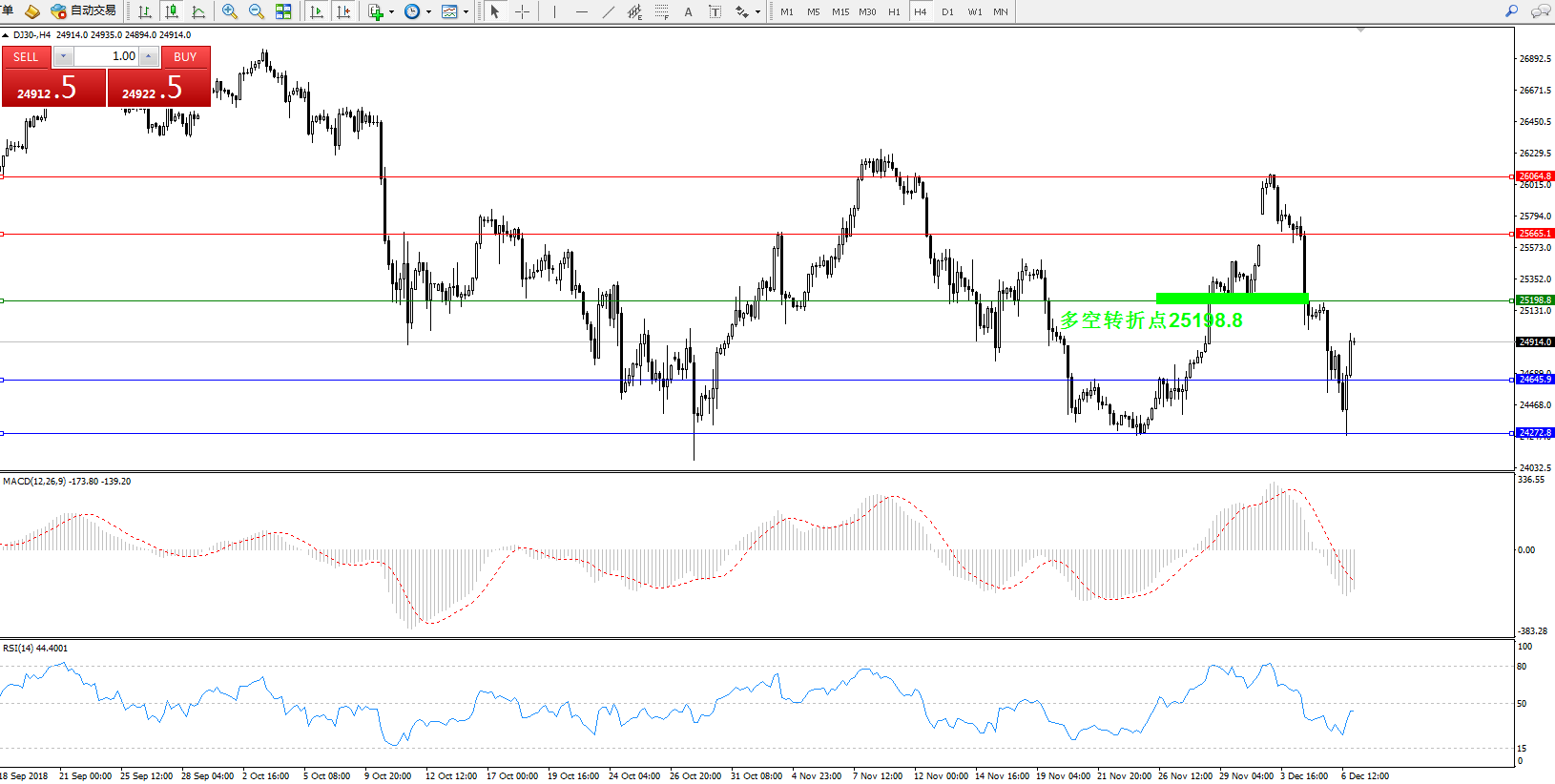 道琼斯指数DJ30——4小时K线图显示: