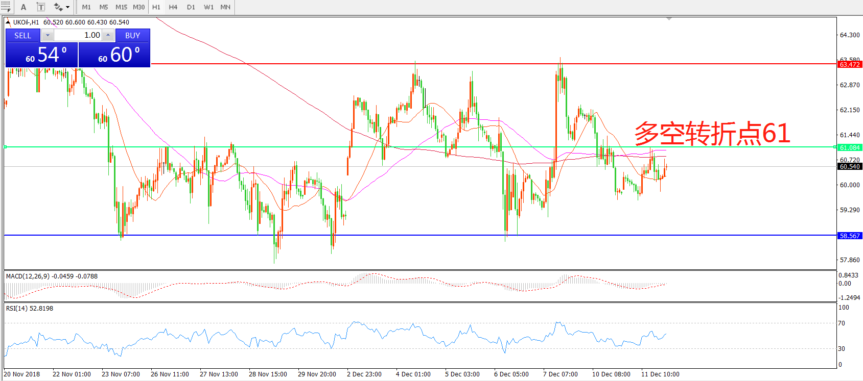 交易策略:在61.00之下看跌,目标58.00    55.00