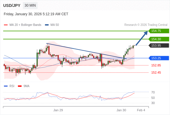 在 153.25 之上,看涨,目标价位为 154.30 ,然后为 154.75 。