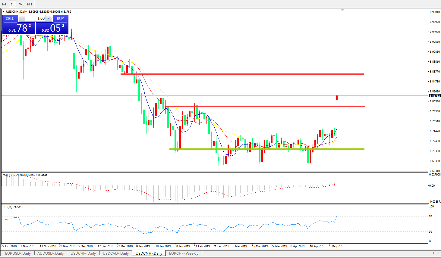 交易策略: 在6.6990之上,看涨,目标价位为6.7845,然后为6.8200。
