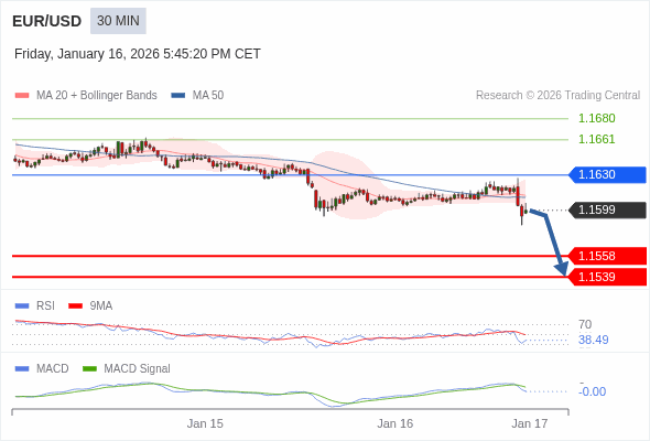 欧元/美元 当日内 : 看跌,在 1.1630 之下。
