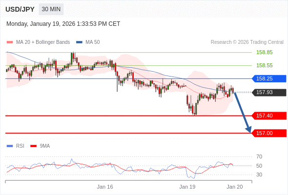 交易策略: 在 158.25 之下,看跌,目标价位为 157.40 ,然后为 157.00 。