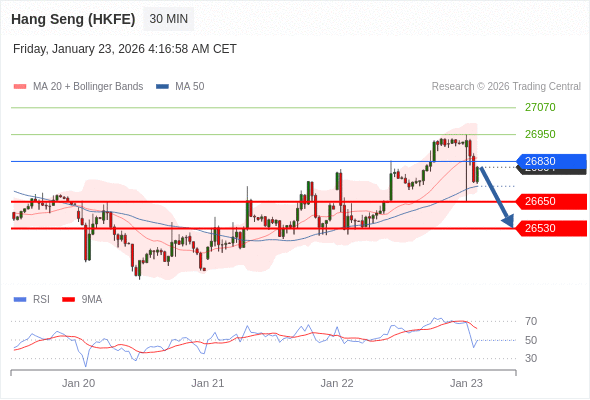 香港恒生指数期货 当日内: 下跌趋势。