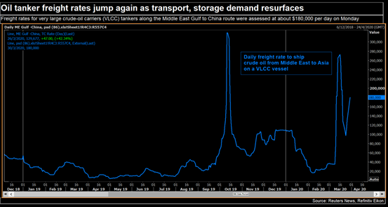 租用油轮屯油,是一种应对严重过剩的灵活方式。毕竟船是随时可以启动。但这也会挤占了可用的运输能力。4月份的过剩严重,预计屯油的数量将进一步攀升。运费在沙特发动价格战后,一飞冲天。中东到中国的运费从1.5美元/桶涨到6-8美元/桶。其后出现理性回落,但是,这两天又重新涨起来。