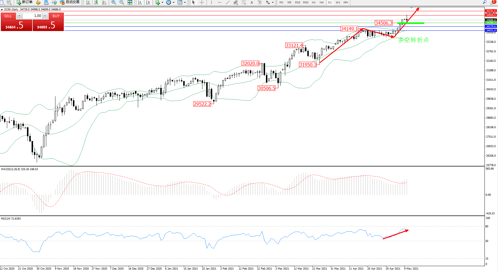 交易策略:34506上方看涨,目标34959、35231