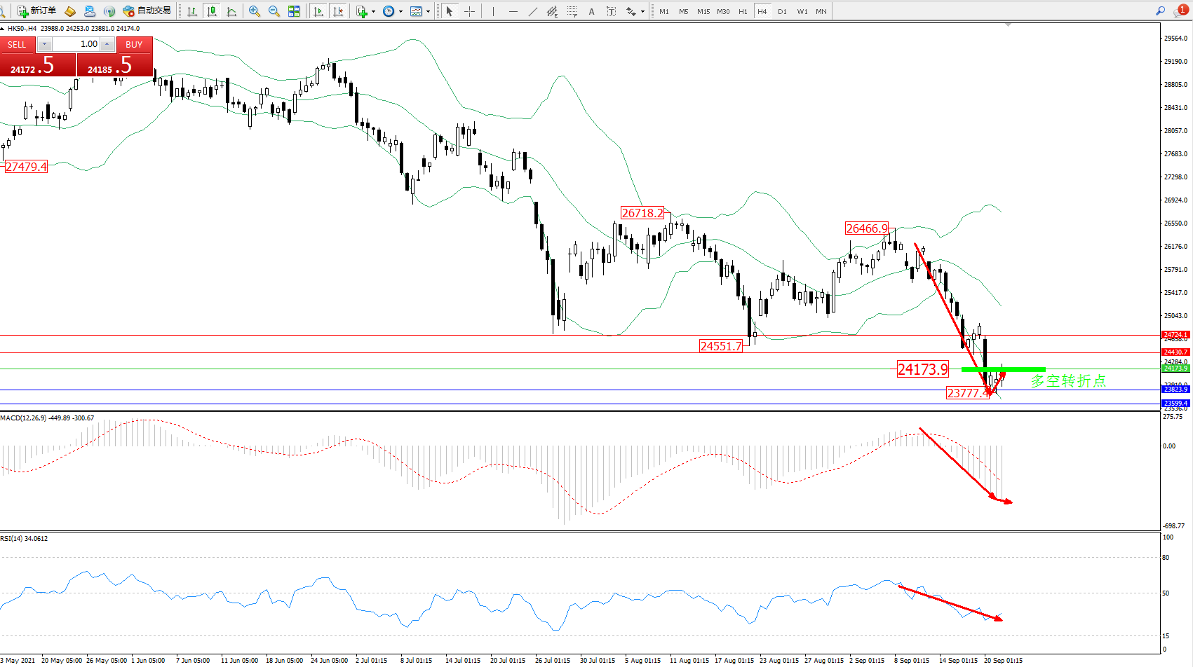 恒指HK50 ——4小时K线图显示: