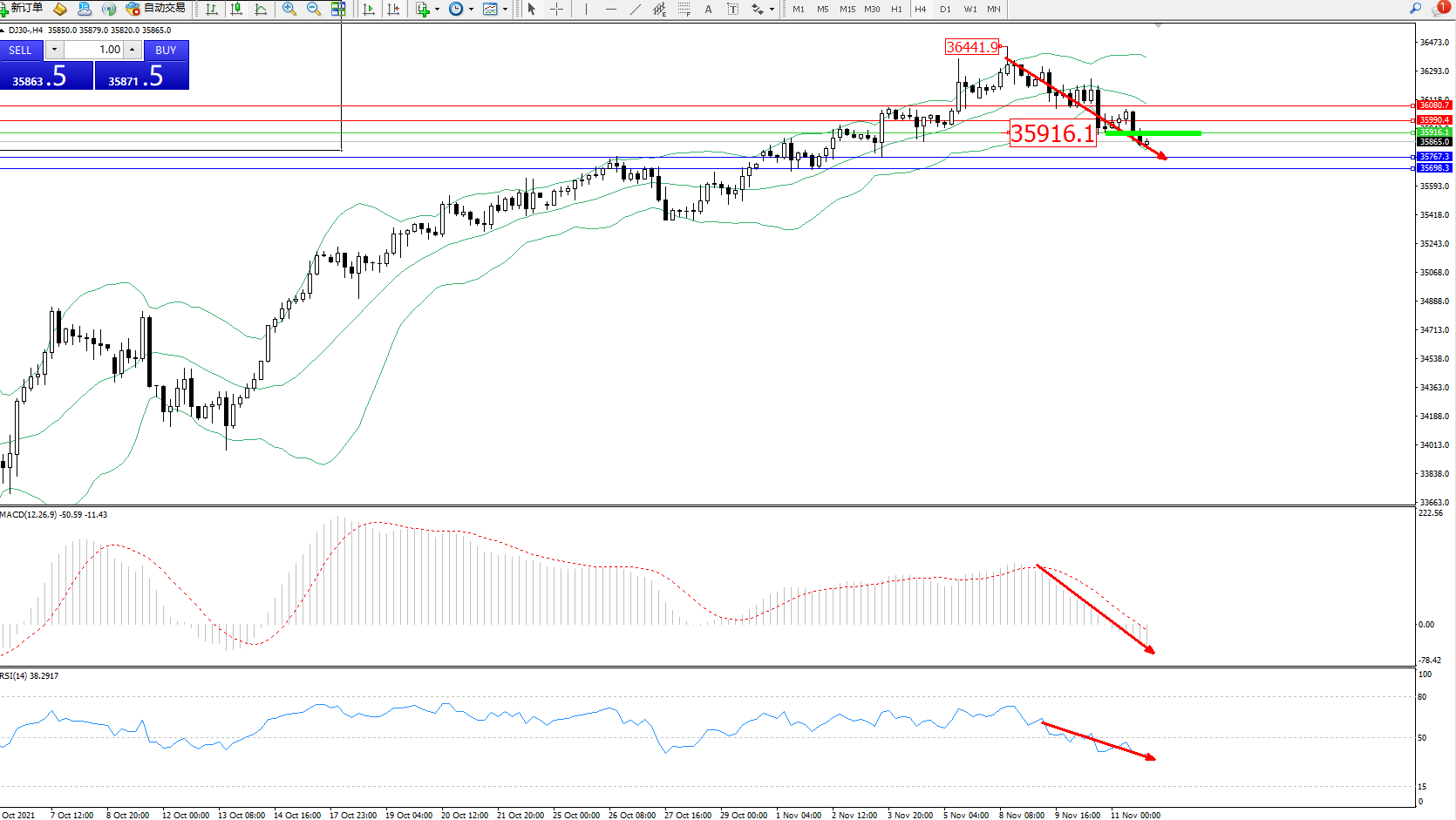 道琼斯指数DJ30——4小时K线图显示: