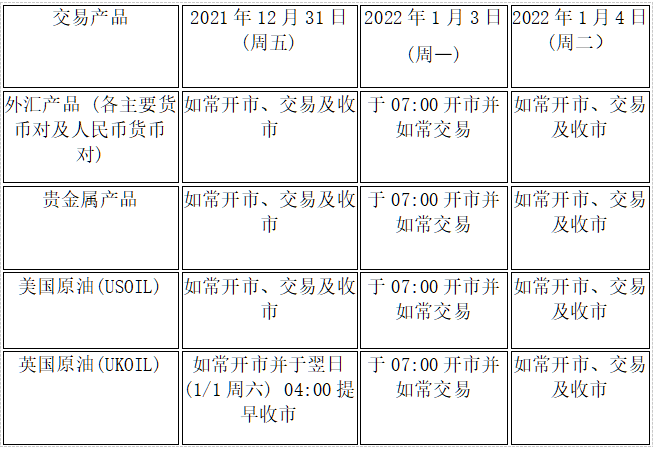 由于元旦假期影响,本公司以下产品的交易时间将于2021年12月31日(周五)至2022年1月4日(周二)作出如下安排,敬请留意。