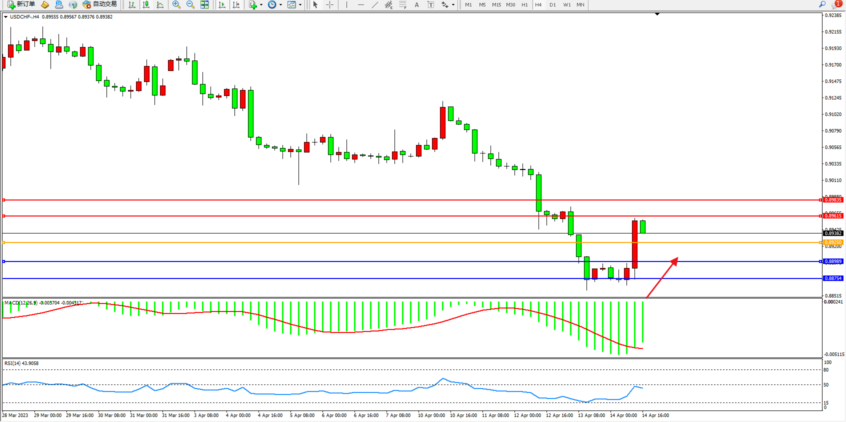 美元瑞郎USDCHF——4小时K线图显示: