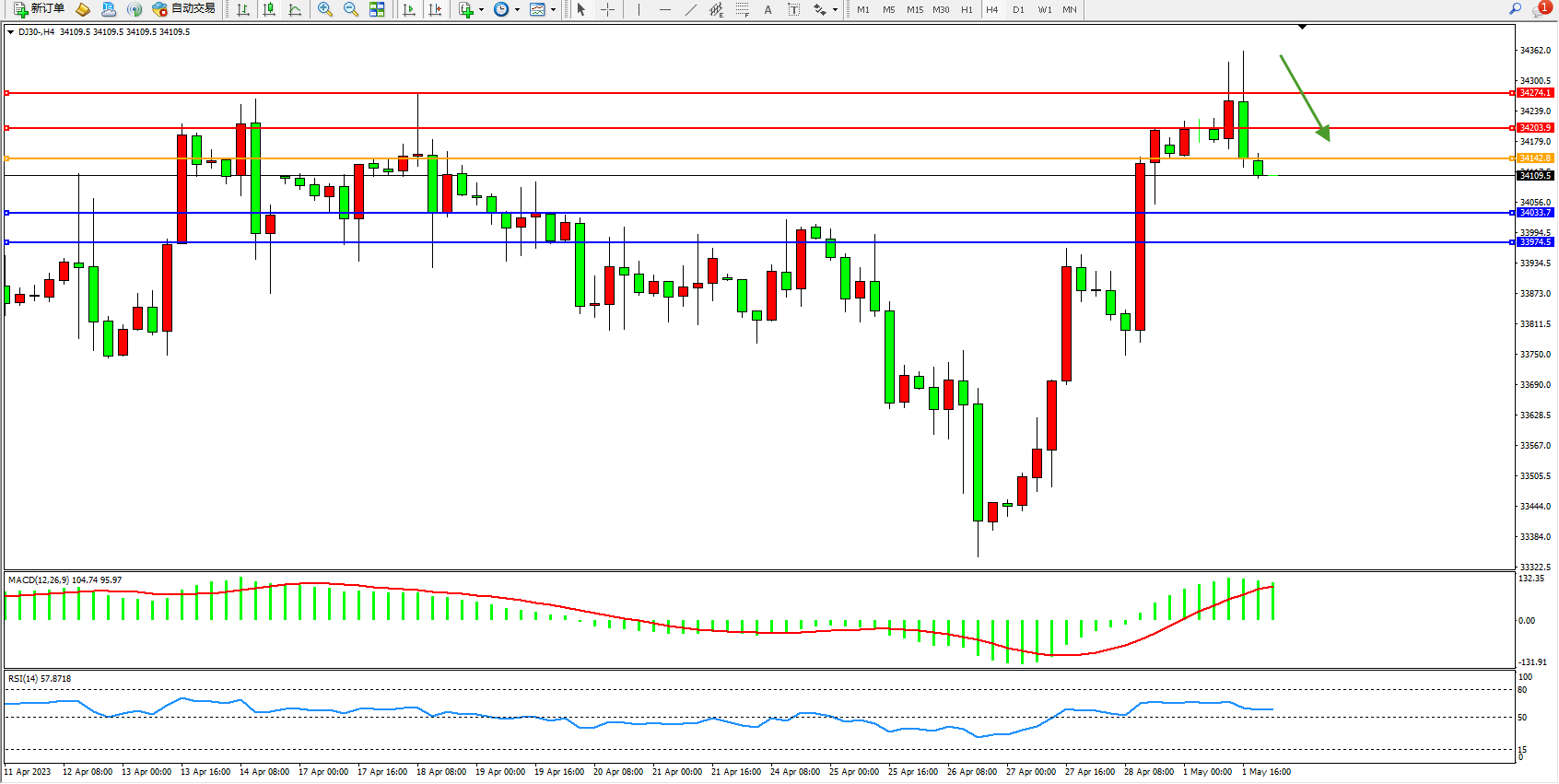道琼斯指数DJ30——4小时K线图显示: