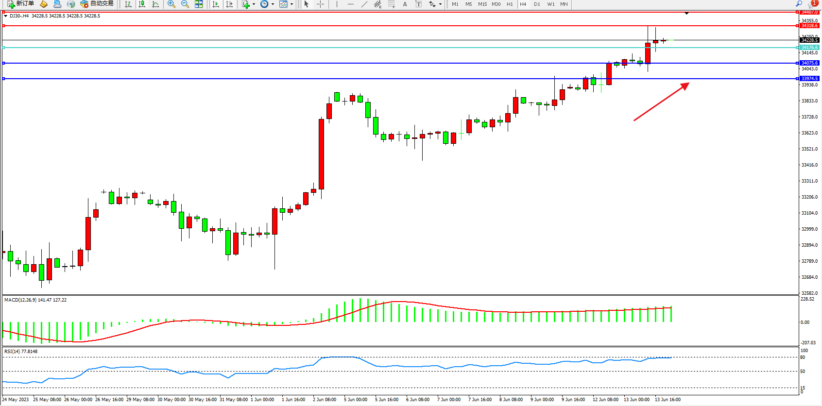 道琼斯指数DJ30——4小时K线图显示: