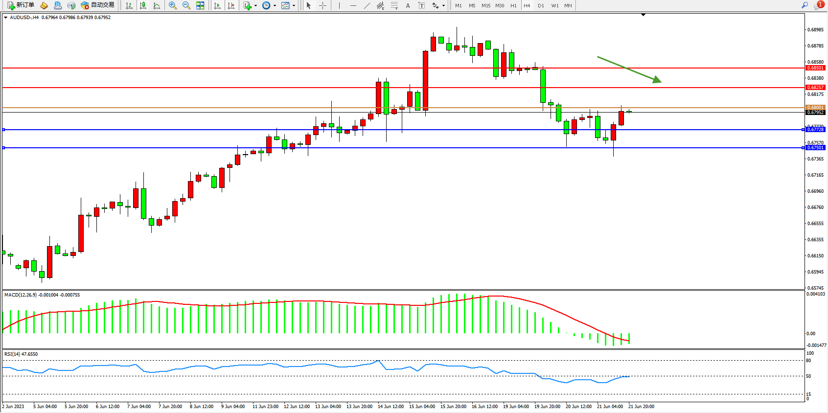 交易策略:0.68001下方看跌,目标0.67728  0.67501